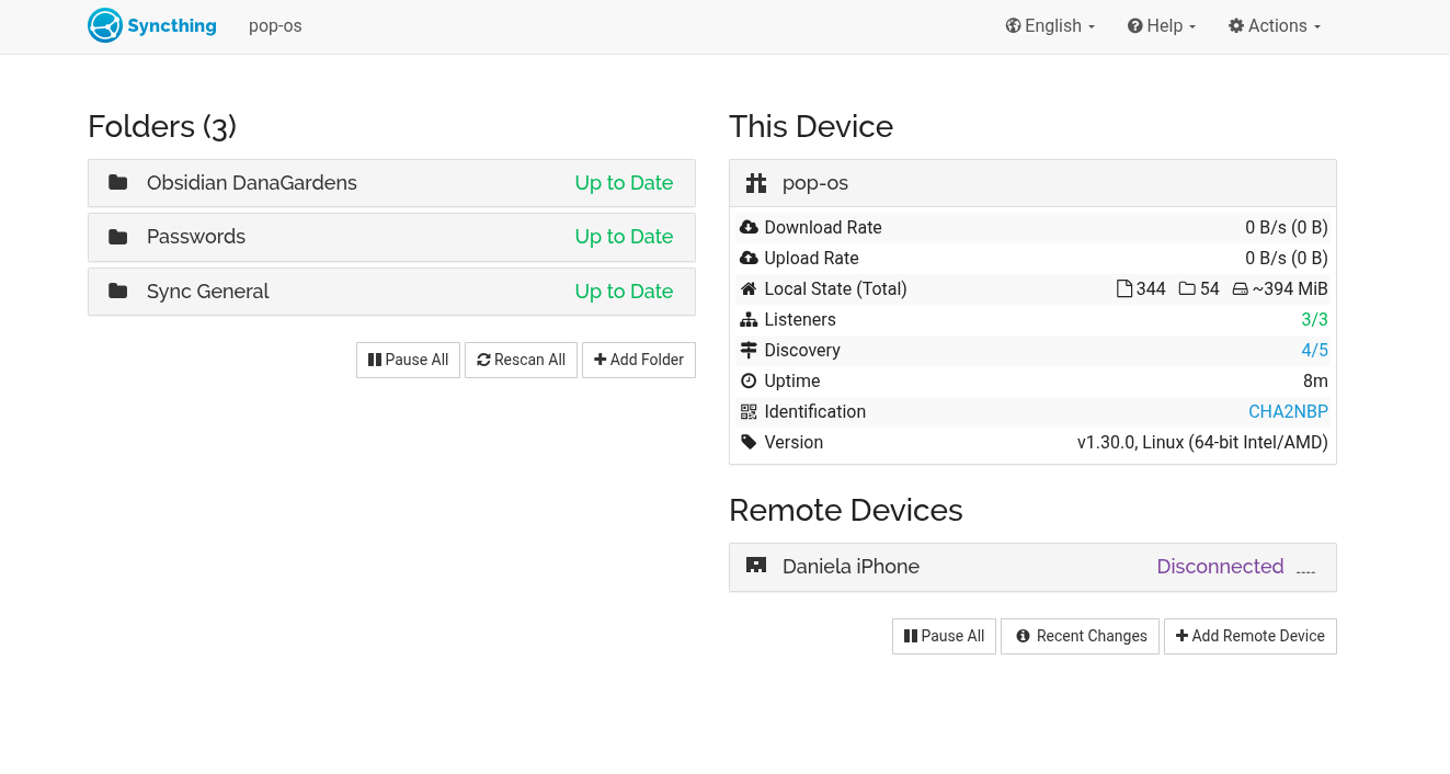 Syncthing is a continuous file synchronization program. It synchronizes files between two or more computers.